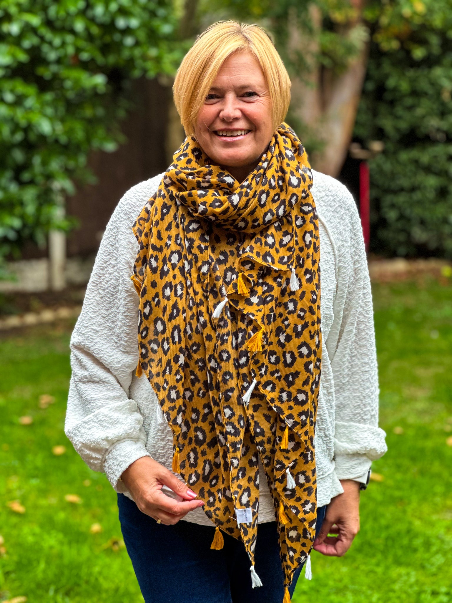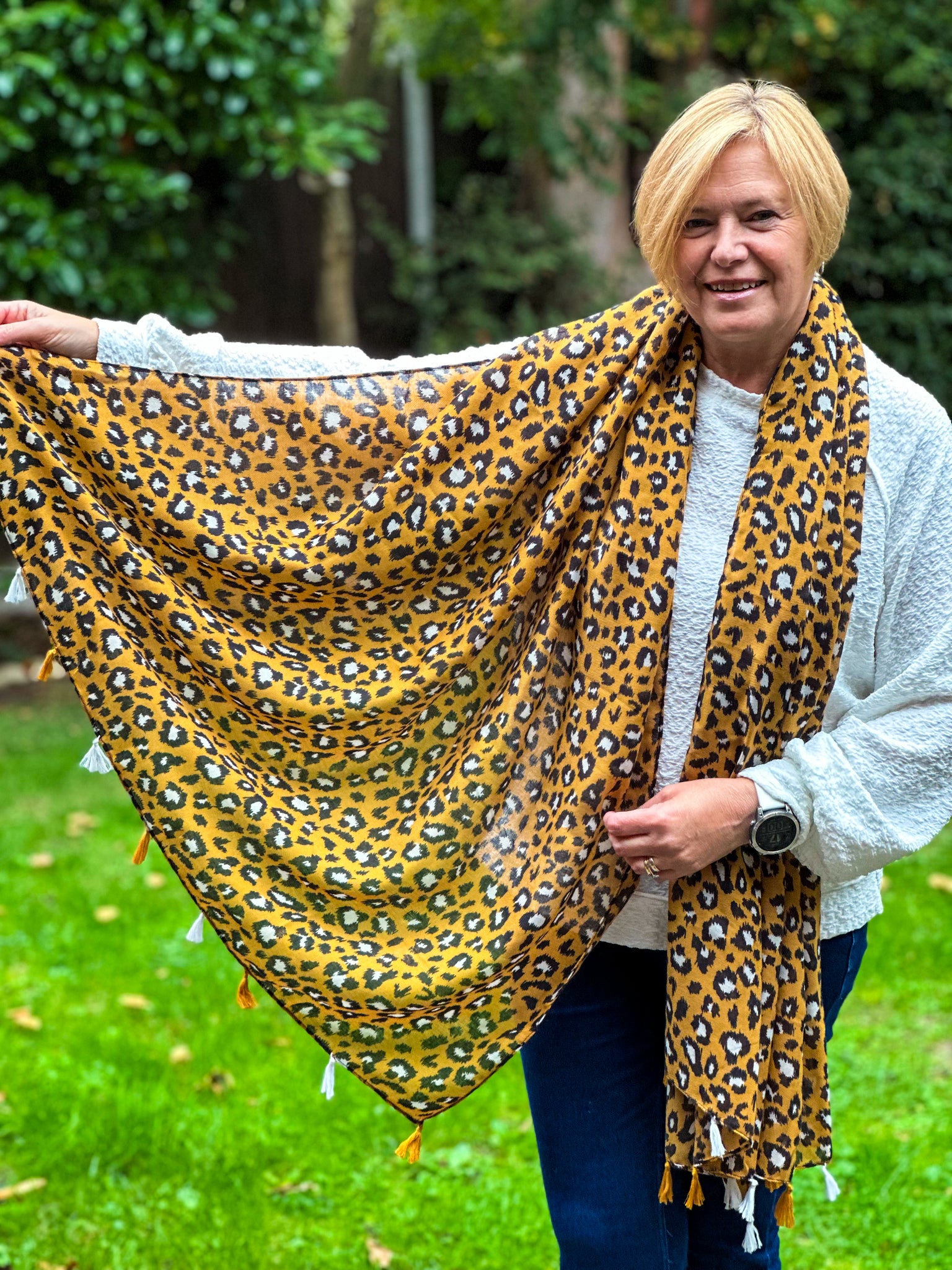Ladies Leopard Animal Print Camel Black Tassel Fashion Scarf