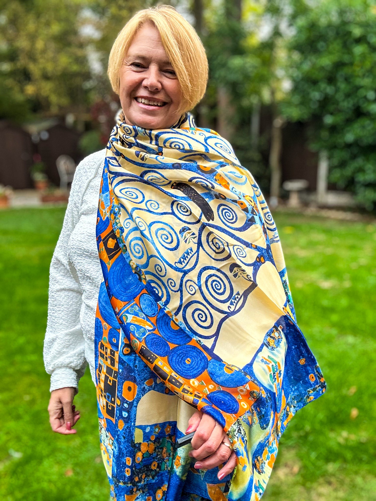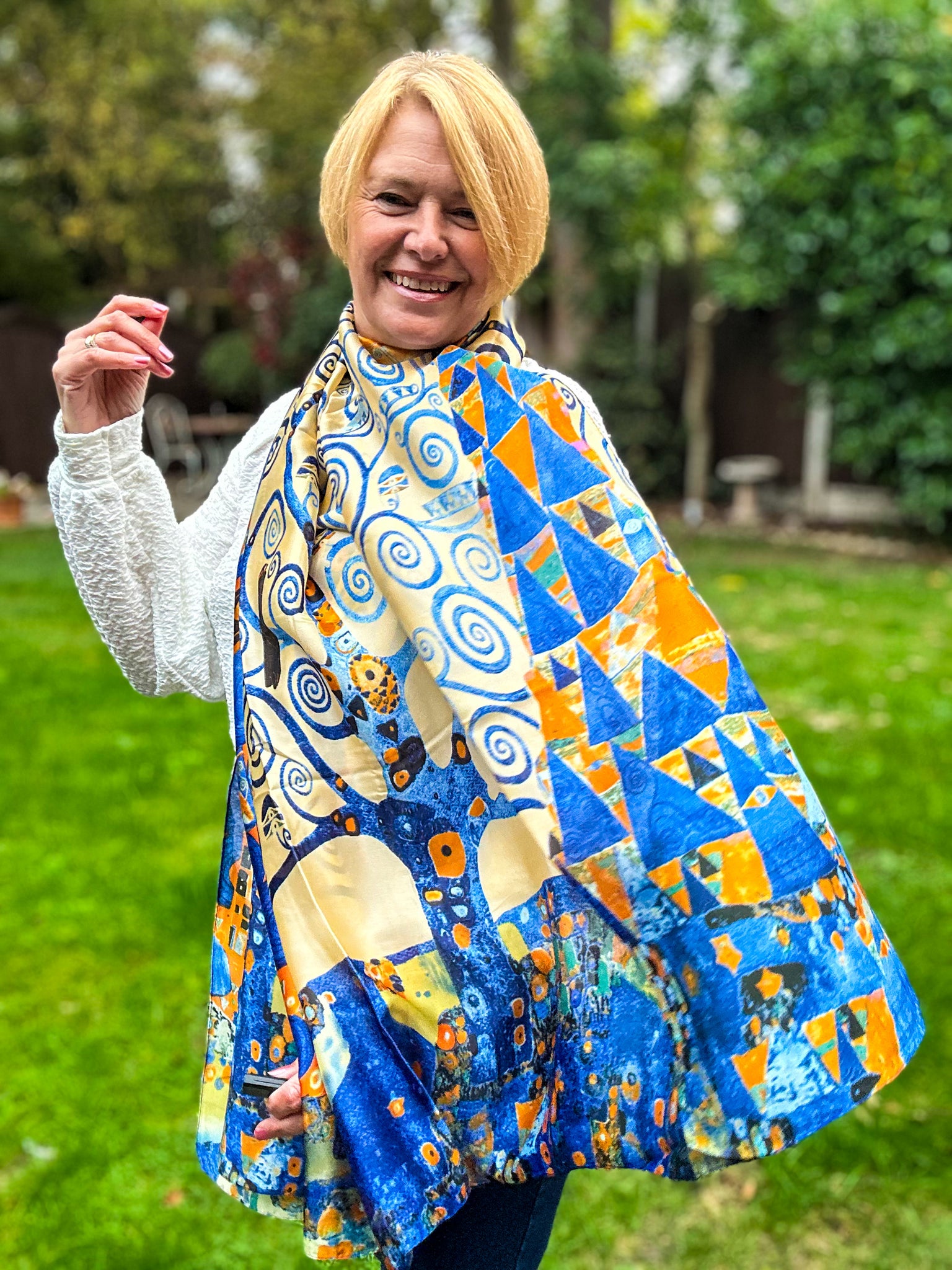 Ladies 100% SILK Painter Klimt Tree of Life Print BLUE ORANGE Fashion Scarf