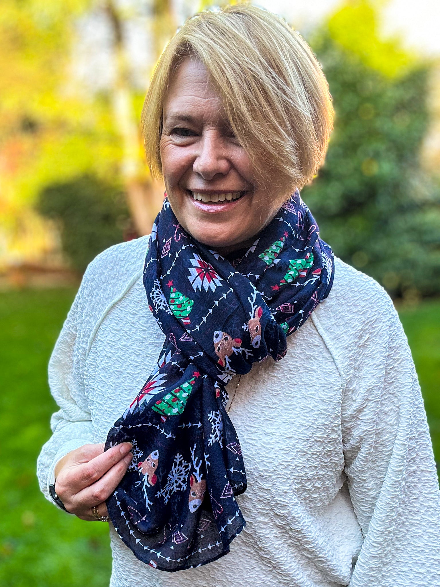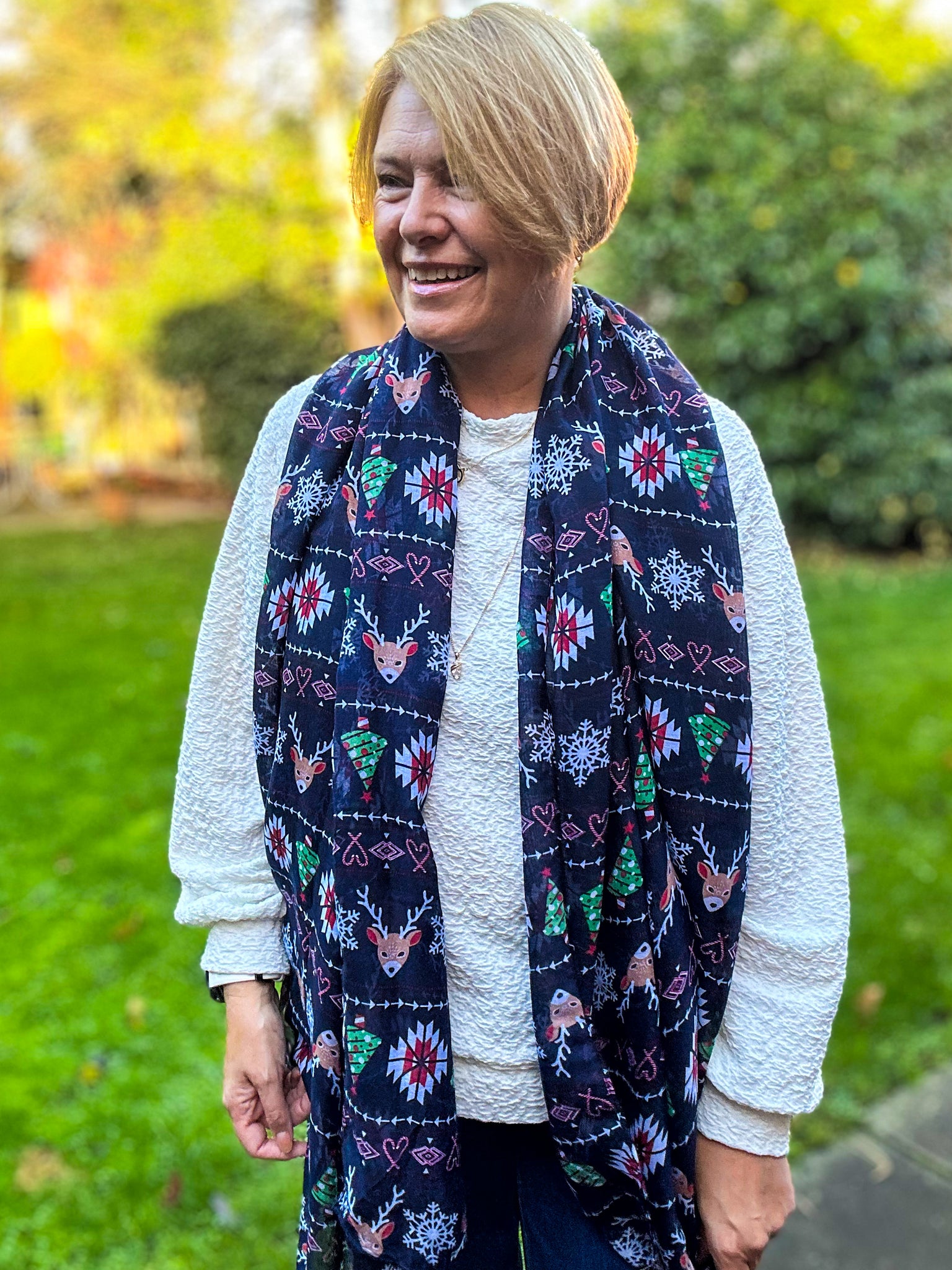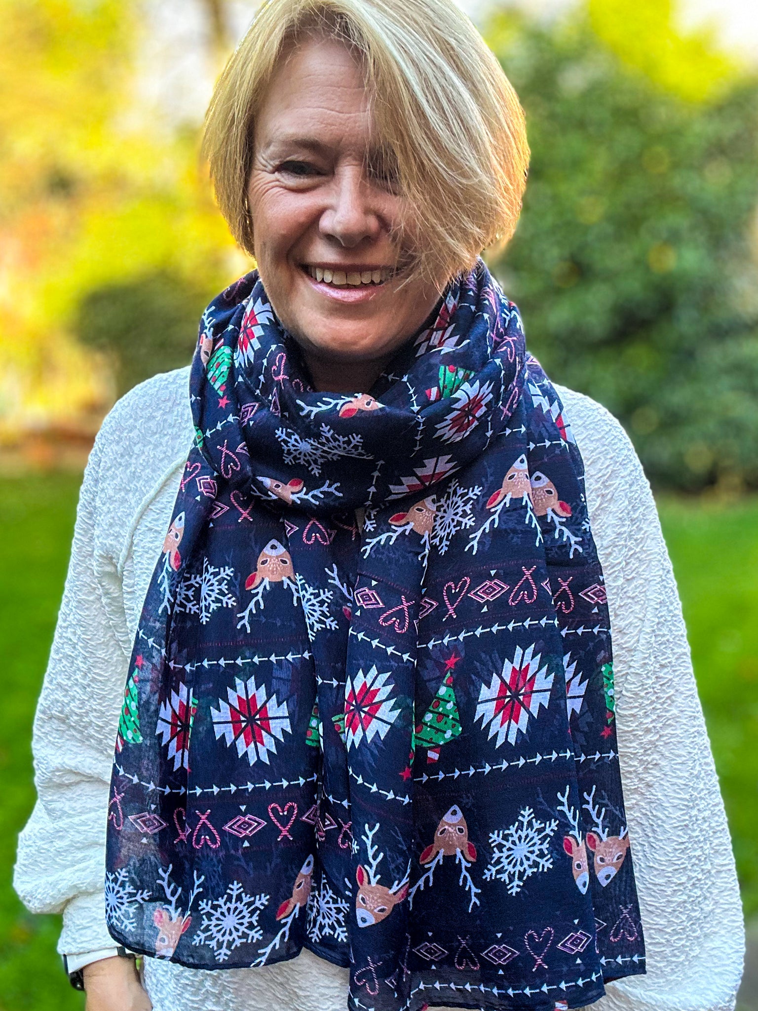 Embrace timeless holiday elegance with this sophisticated fairisle reindeer and snowflake print fashion scarf in navy blue. Crafted with a classic fairisle pattern, this scarf showcases delicate reindeer and snowflake motifs that capture the essence of a traditional winter wonderland. The rich navy base provides versatility and pairs seamlessly with both casual and dressed-up seasonal looks. Ideal for layering during cold months, this scarf delivers both warmth and refined style, making it an essential accessory for the festive season or a treasured gift for the discerning shopper.