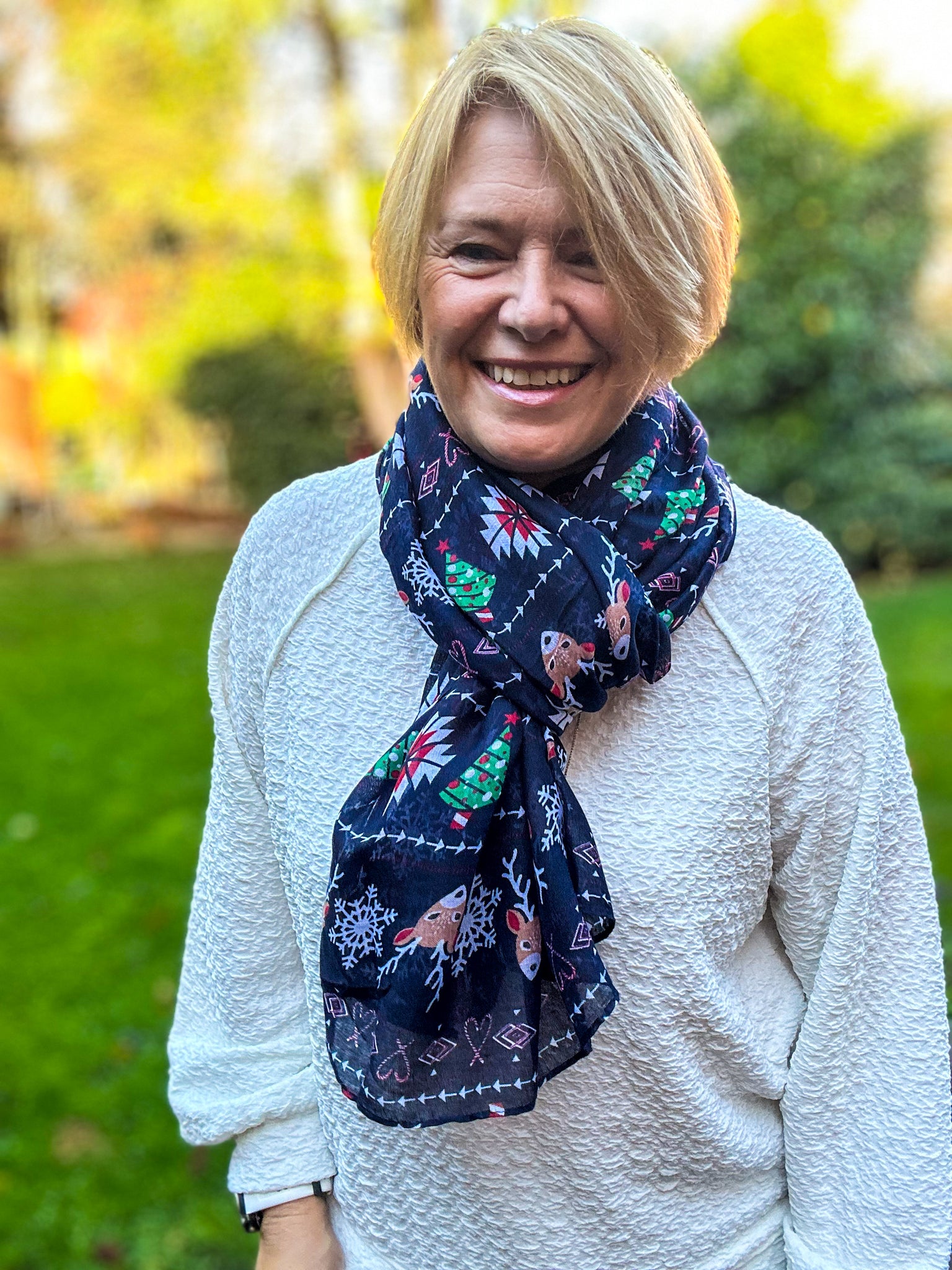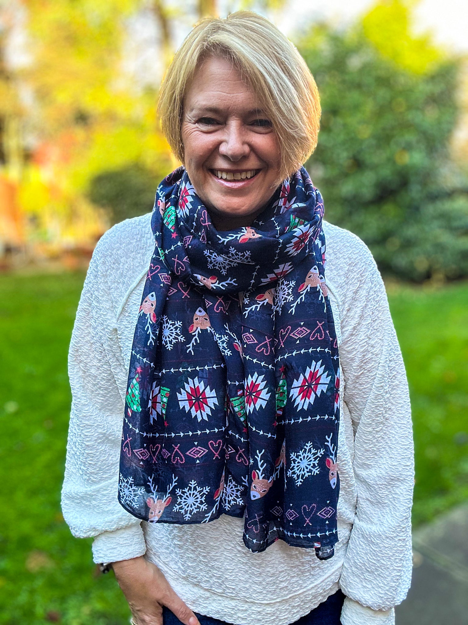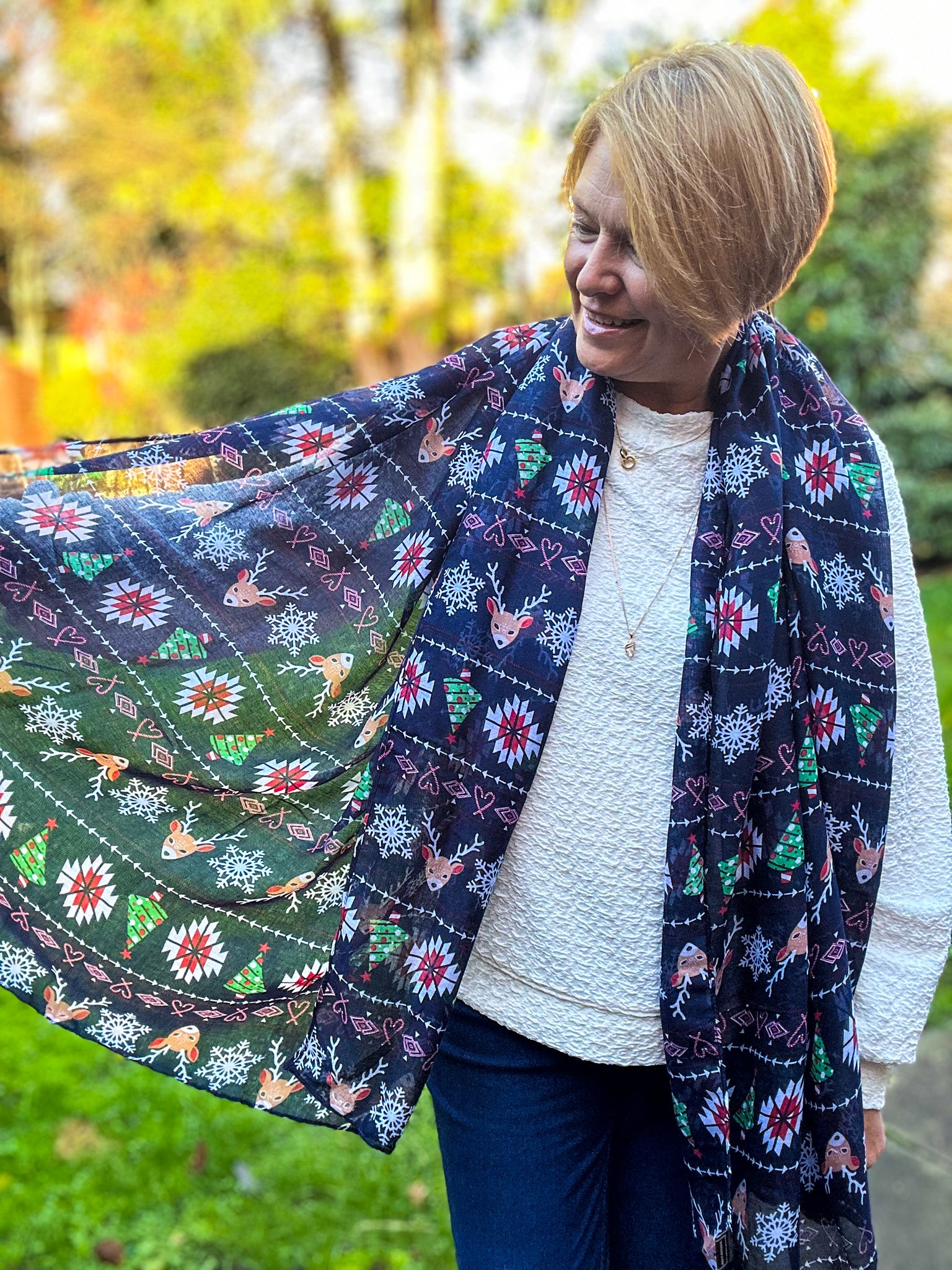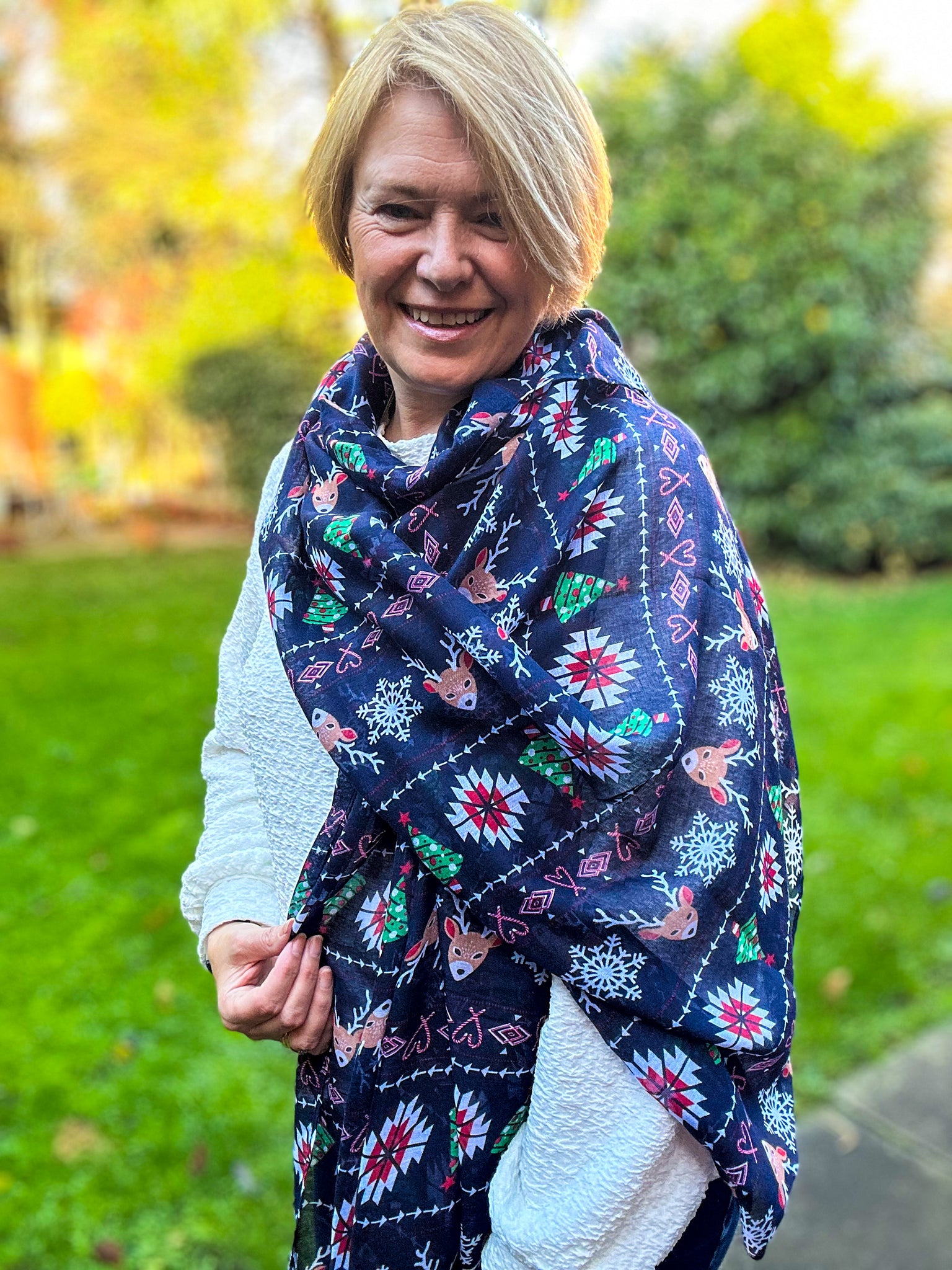Embrace timeless holiday elegance with this sophisticated fairisle reindeer and snowflake print fashion scarf in navy blue. Crafted with a classic fairisle pattern, this scarf showcases delicate reindeer and snowflake motifs that capture the essence of a traditional winter wonderland. The rich navy base provides versatility and pairs seamlessly with both casual and dressed-up seasonal looks. Ideal for layering during cold months, this scarf delivers both warmth and refined style, making it an essential accessory for the festive season or a treasured gift for the discerning shopper.