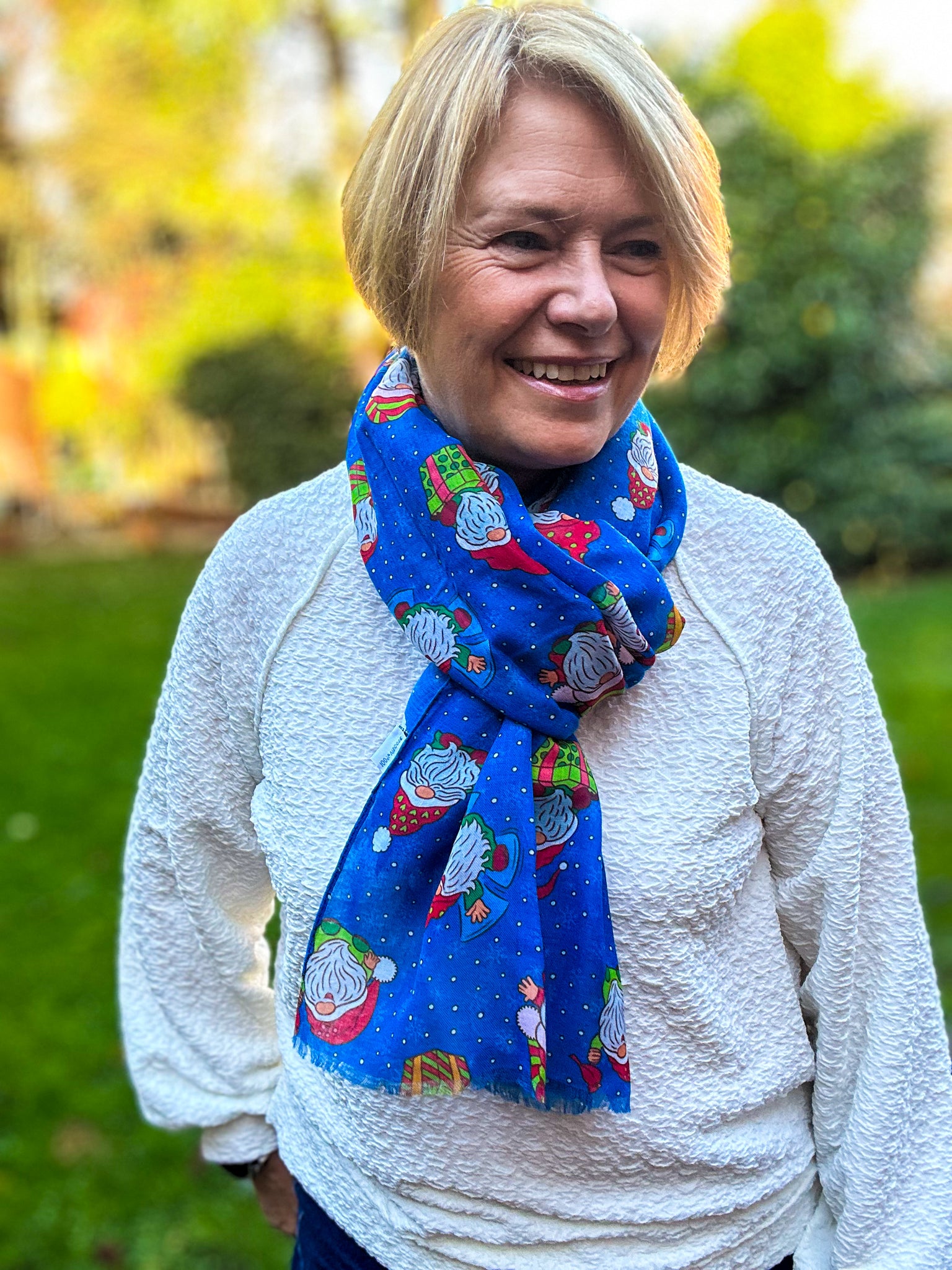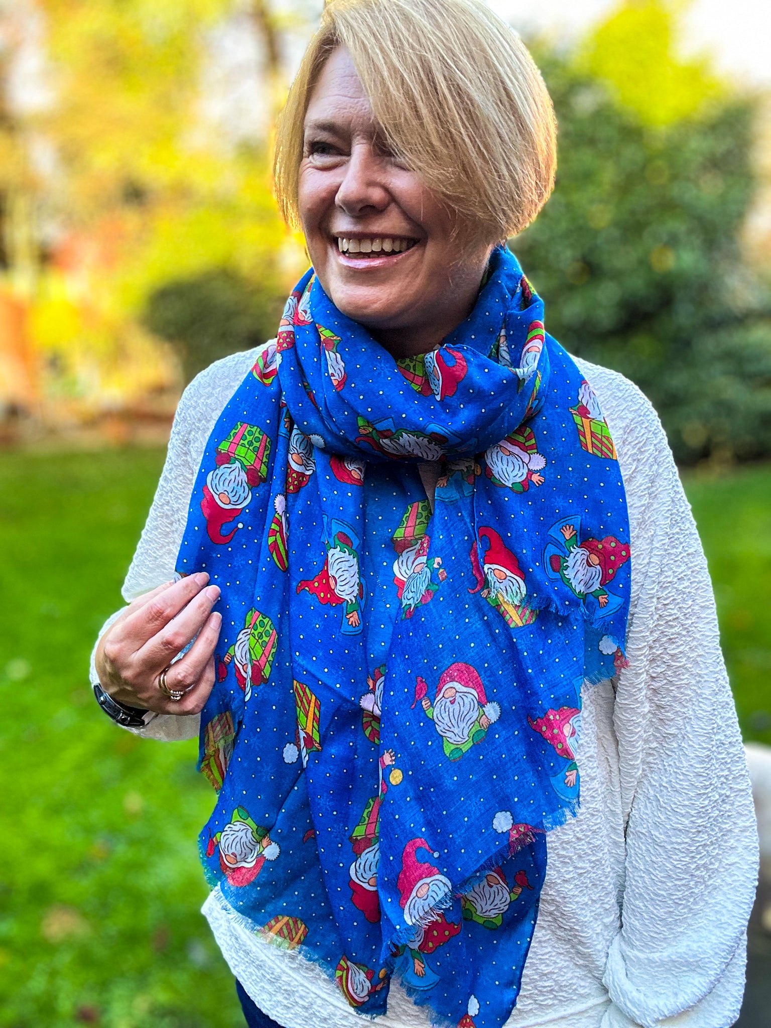 Ladies Christmas Gonk Santa Print Fashion Scarf - BLUE