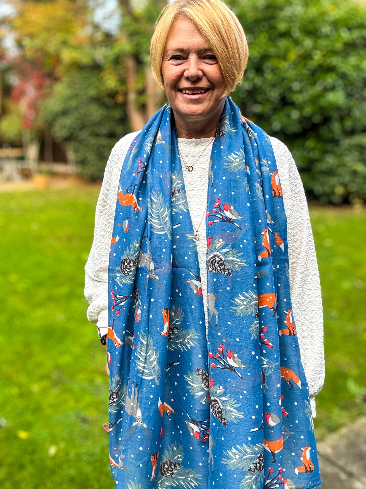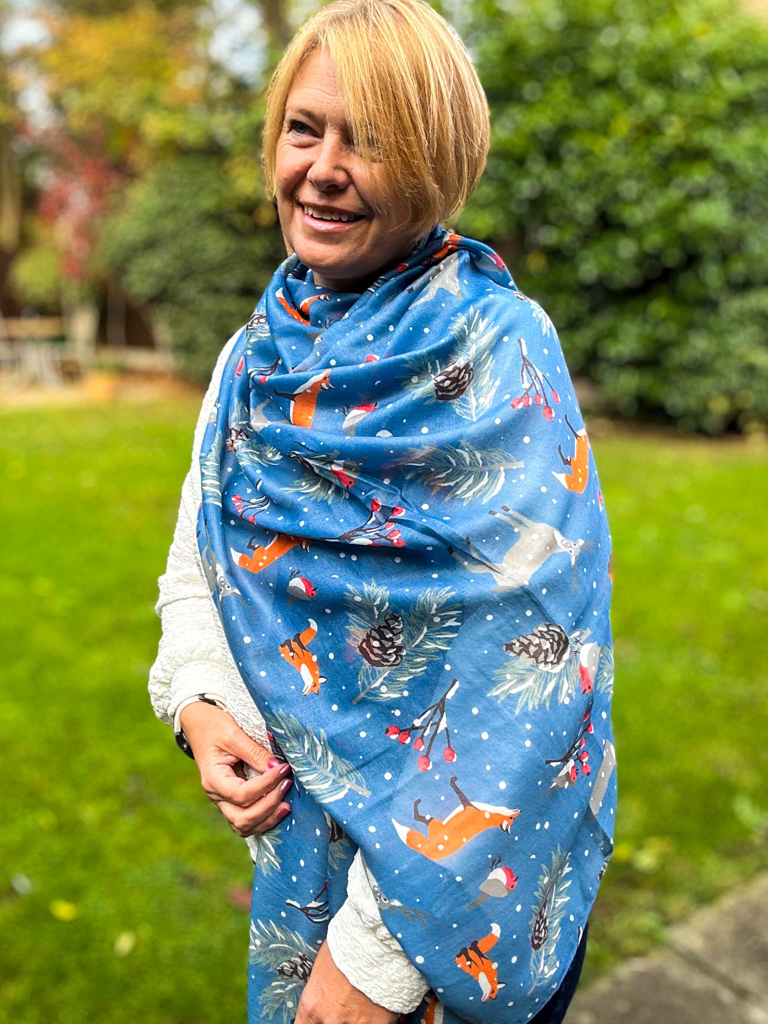 This ladies' fashion scarf combines festive woodland charm with practical warmth. Featuring a delightful fox and robin Christmas print on a versatile denim blue background, it adds a seasonal touch to any outfit. Crafted for all-day comfort, it’s perfect to brighten your winter wardrobe while keeping you cozy throughout the holidays.