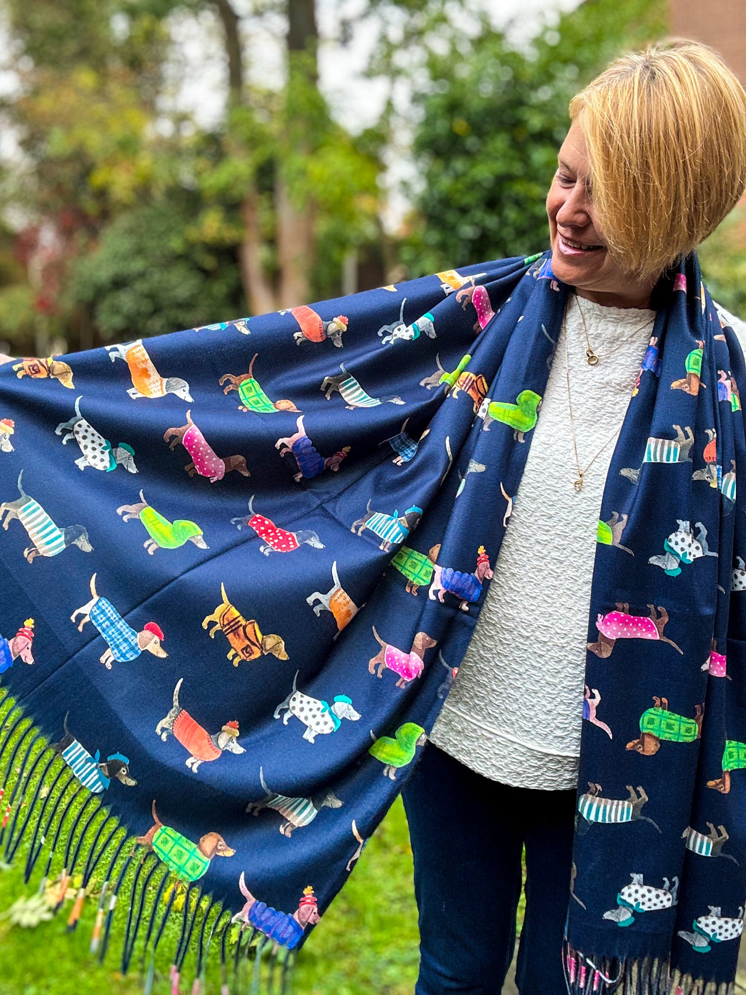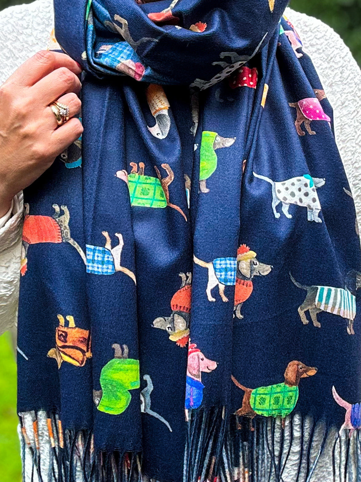 Ladies Dog Puppy Print NAVY BLUE Warm Tasseled Scarf