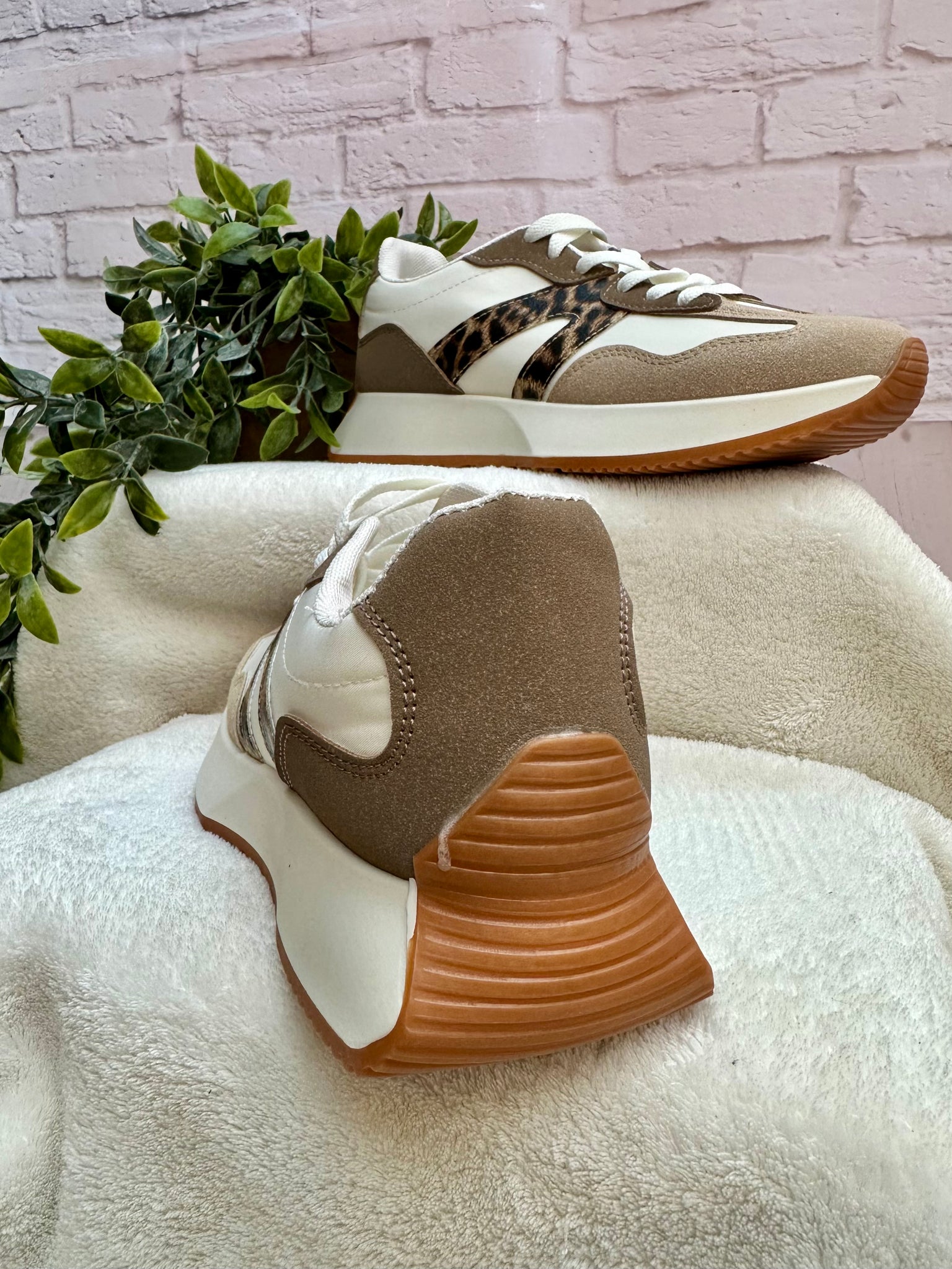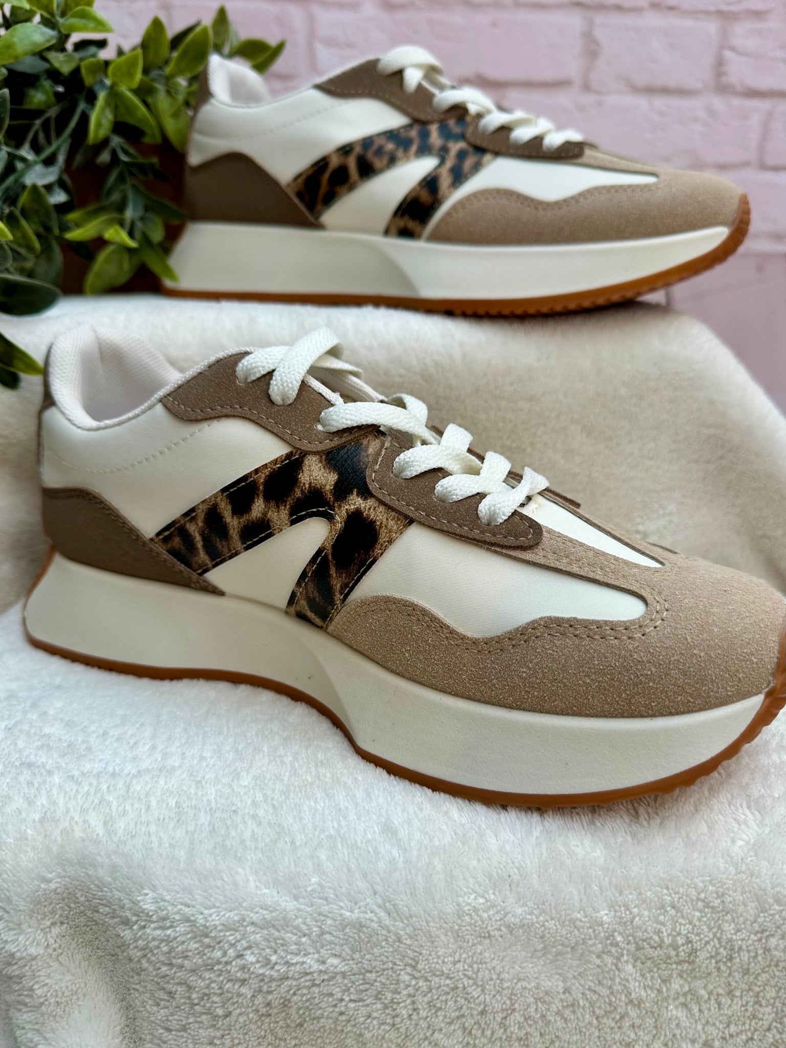 A versatile and trending style trainer. They perfectly merge a neutral palette with a bold leopard print accent. The mixed-material design (typically faux suede and PU panels)