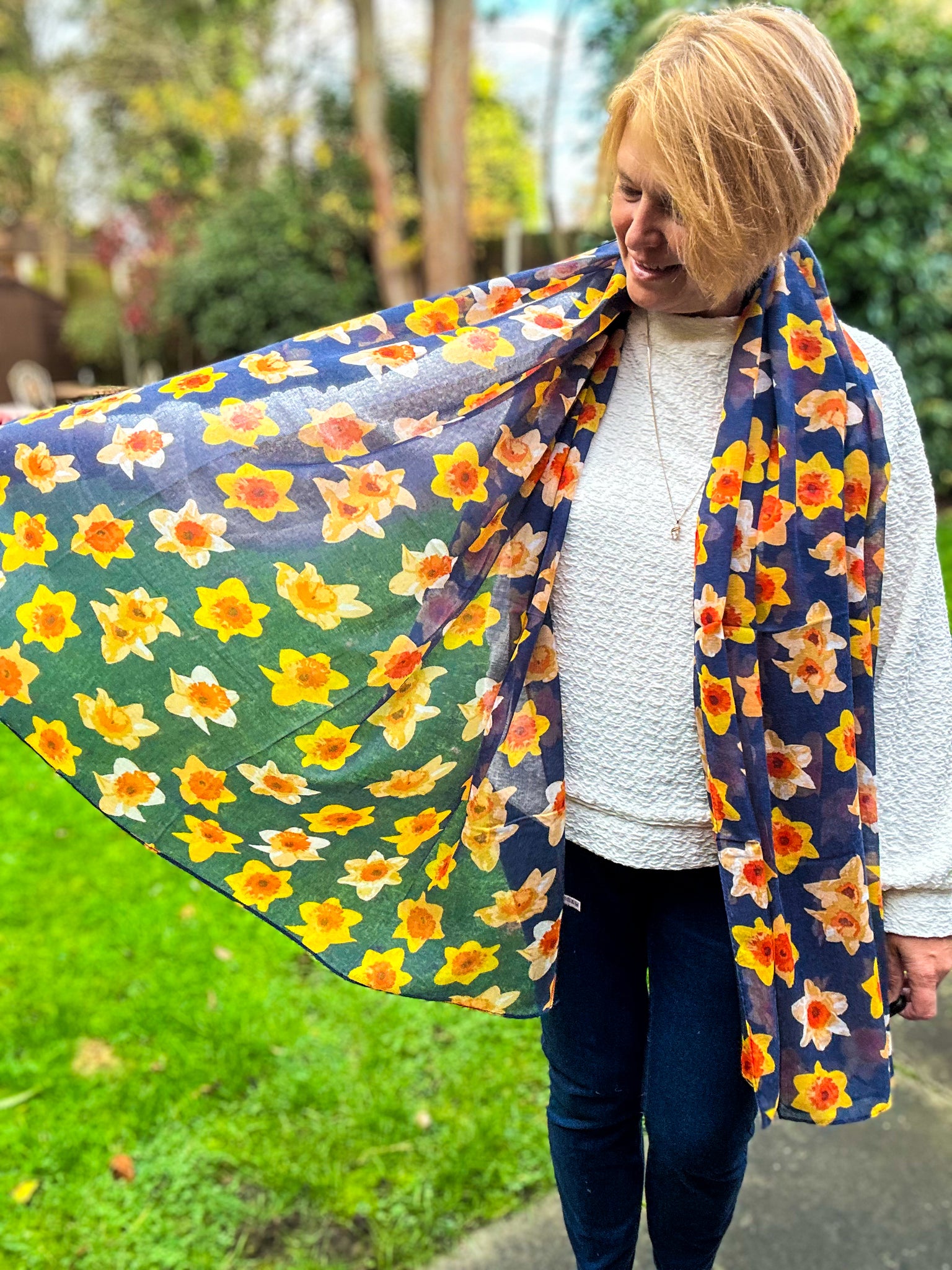 Ladies Yellow Daffodil Print NAVY BLUE Fashion Scarf